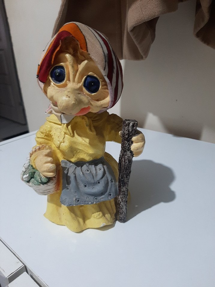 Büyük mavi gözlü, renkli başörtülü, sarı elbiseli ve gri önlük takan figürin. Elinde baston ve sepet bulunuyor. ♀️