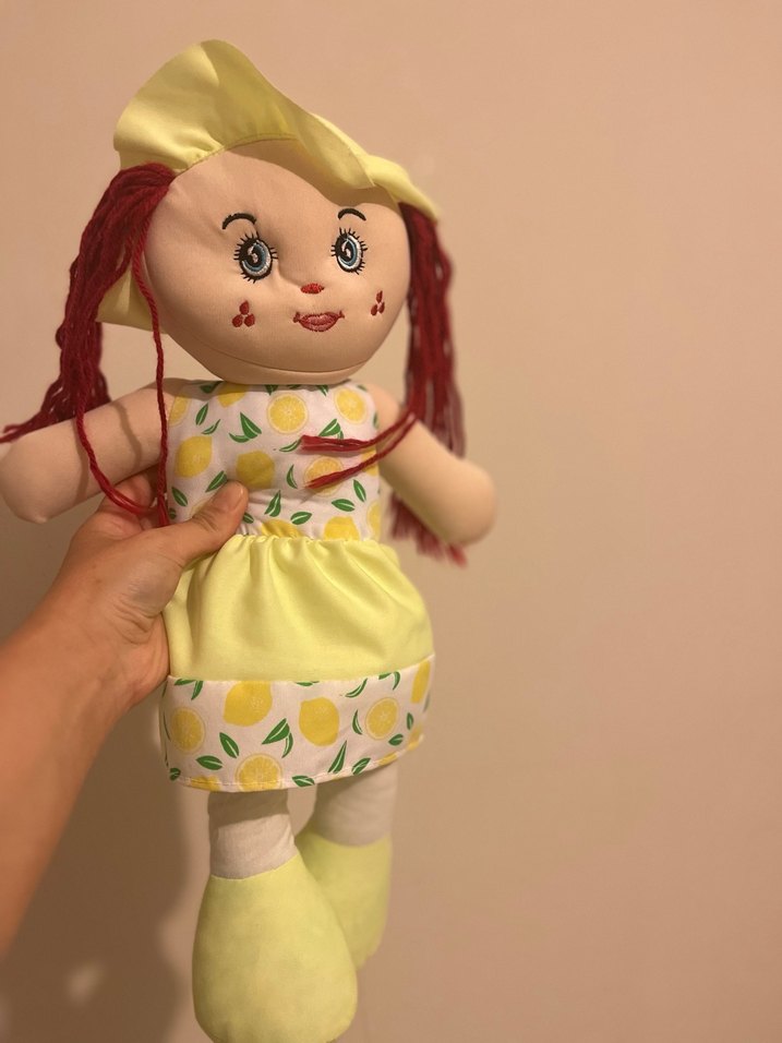 Renkli bebek, sarı limon desenli elbise, yumuşak kumaş gövde ve kırmızı ip saçlara sahiptir. Nakışlı yüz detayları ve sarı ayakkabıları vardır.