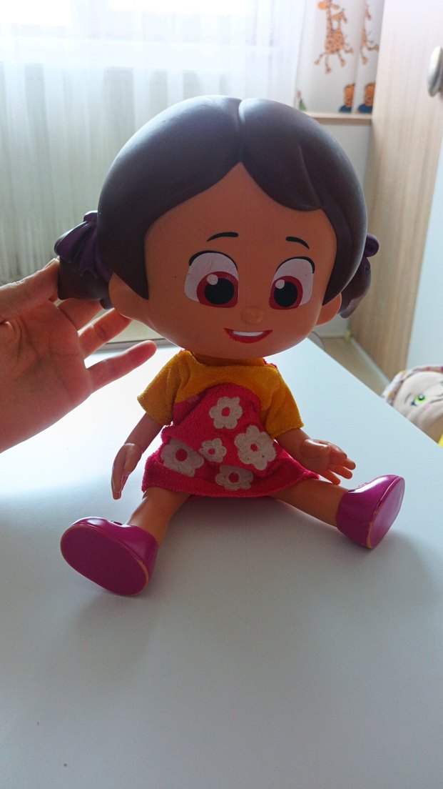Sarı üst ve beyaz çiçekli kırmızı etekli, mor ayakkabılı, saçları iki yandan topuzlu renkli oyuncak bebek.