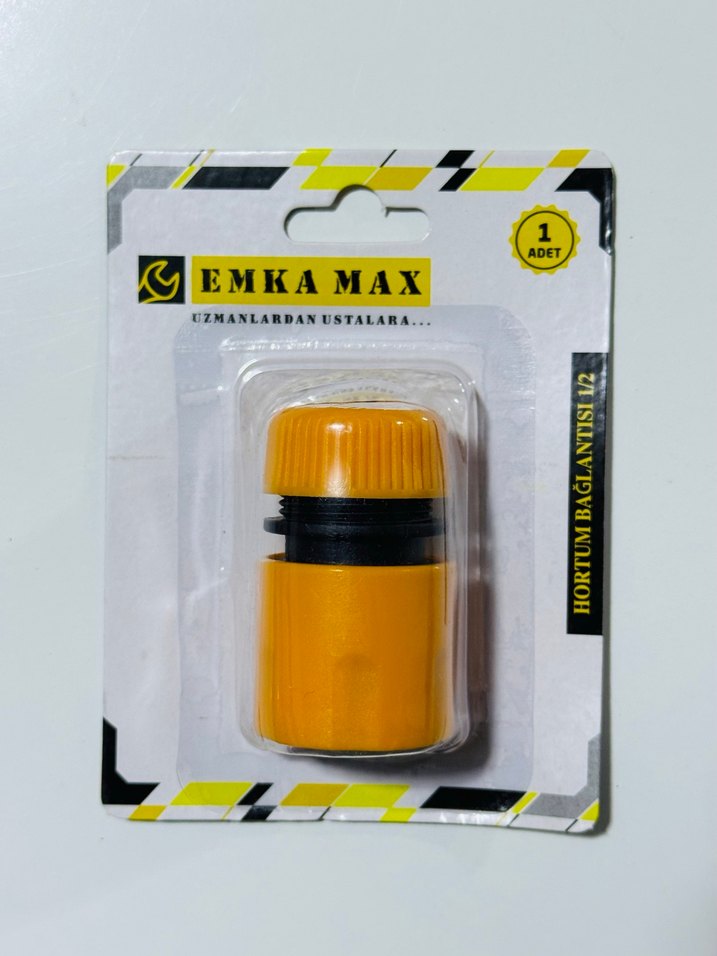 Sarı renkte Emka Max marka hortum bağlantısı, sağlam vidalı kapaklıdır ve dayanıklıdır. Kullanımı kolaydır.