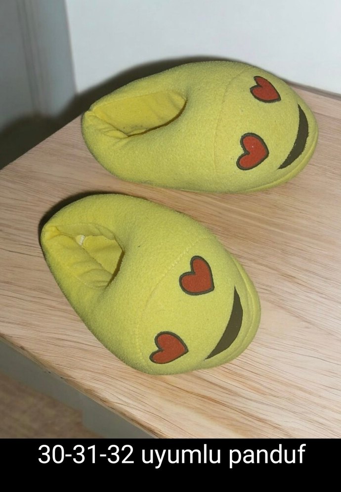 Sarı renkli, kalp gözlü emoji nakışlı, düğmeli kız çocuk pandufu. 30-32 numaraya uygundur. Bohem tarzda gri olan 29 30 31 uyumlu 50 TL. isteyen tek alır isteyen İkisini birlikte alır tek kargoda gönderim yaparım ikisi birlikte 120 TL