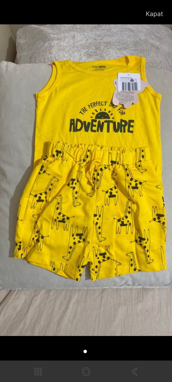 Kolsuz, sarı ve fırfırlı erkek bebek takımı. Alt kısmı zürafa desenli renkli baskılı şortlardan oluşur. Üst kısmı askısız yaka ve "ADVENTURE" yazılıdır.