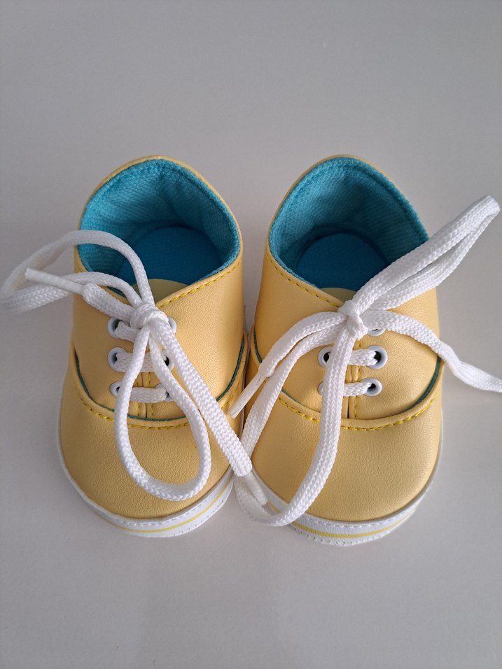 Sarı, beyaz bağcıklı, yumuşak kauçuk benzeri malzemeden yapılmış erkek bebek ilk adım ayakkabısı. Rahat ve sade tasarım renkli detaylarla tamamlanıyor.