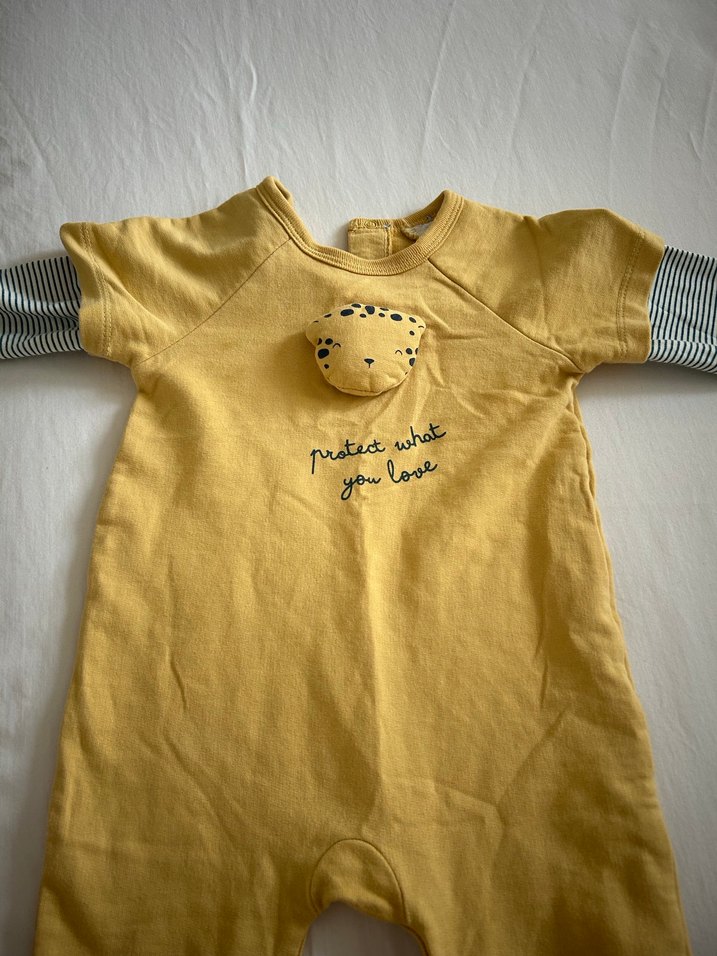 Sarı renkli, kısa kollu ve bisiklet yakalı erkek bebek tulumu. Örgü dokulu, baskılı ve önünde "protect what you love" yazısı bulunur. Yumuşak ve sıcak kumaştan, sokak stili.