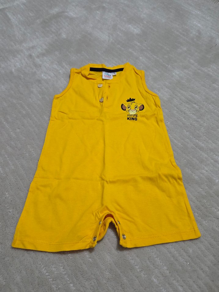 Kolsuz, sarı renkli bebek tulumu, bisiklet yaka ve düğmeli kapama ile. Renkli baskılı, yumuşak ve sıcak kumaşa sahip. Sokak stiline uygun. hiç giyilmedi.