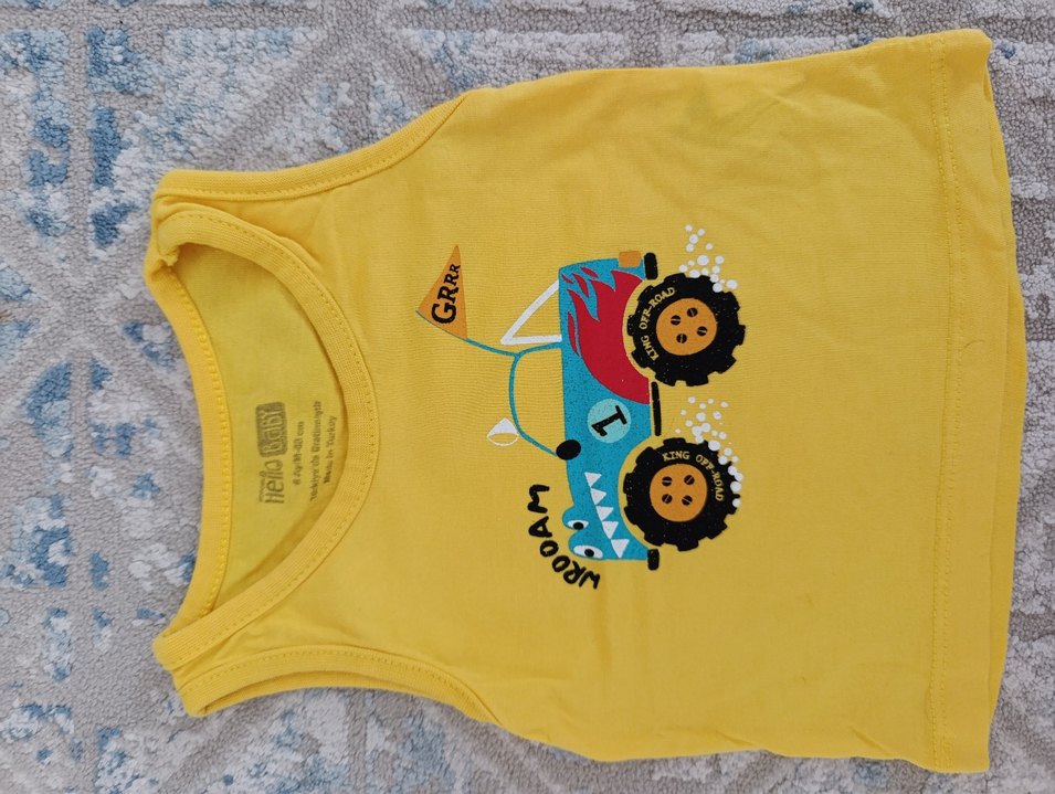 Sarı renkte, kolsuz erkek çocuk tişörtü. Renkli canavar kamyon baskısı, yuvarlak yaka ve vücuda oturan kesim. Yumuşak ve sıcak kumaştan, cırt cırt detaylı.