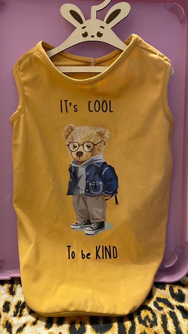 Sarı, kolsuz erkek çocuk yeleği, bol kesim ve yuvarlak yaka. Yumuşak ve sıcak kumaştan, renkli baskılı ayıcık figürü ve "It's COOL To be KIND" yazısı ile.