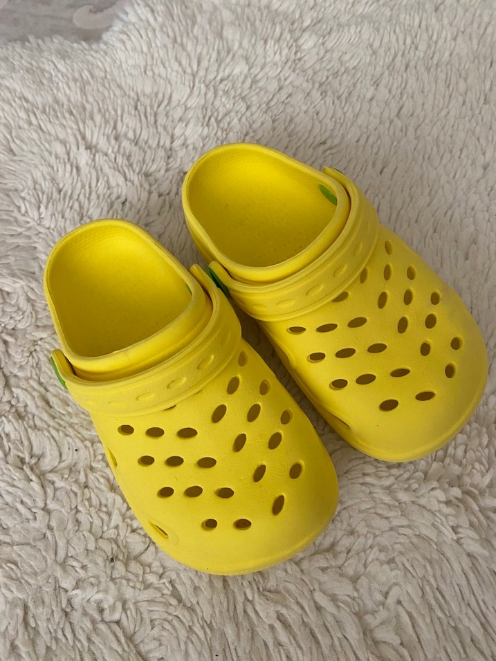 Sarı renkli, cırt cırtlı bantlı çocuk terlikleri, dayanıklı kauçuk malzemeden üretilmiştir ve delikli yapısıyla hava alır.