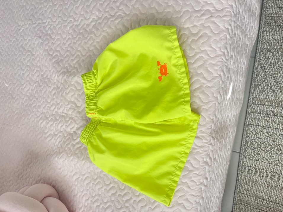 Kolsuz, elastik bel bantlı, küçük turuncu yengeç detaylı parlak sarı erkek çocuk deniz şortu. Rahat ve renkli yüzme için.