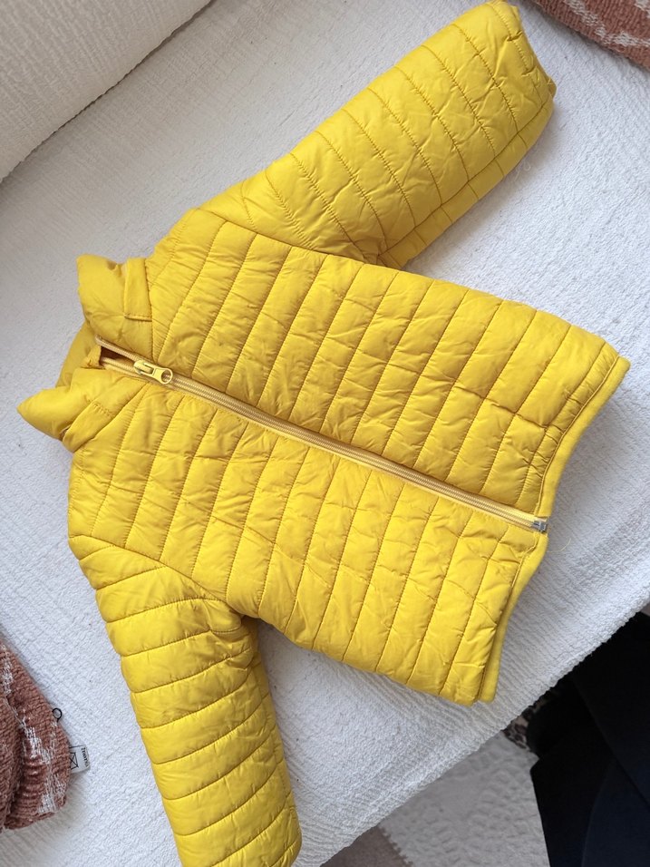 Sarı renkli, dik yakalı ve fermuarlı erkek çocuk ceketi, yumuşak ve sıcak kumaştan, sokak stili için uygundur.