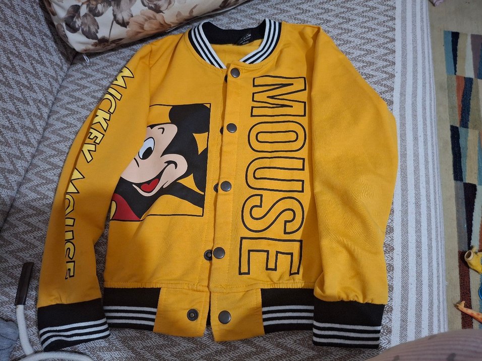Sarı renkli, düğmeli, bol kesim çocuk ceketi. Sentetik kumaştan, notched lapel yakalı, renkli baskılı ve çizgili ribana detaylıdır.