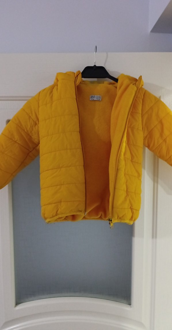 Sarı renkli, fermuarlı ve yakası kesik detaylı erkek çocuk ceketi. Yumuşak ve sıcak tutan polar kumaştan, parlak görünümlü. hafif tüylenme var onun dışında sorunsuz.