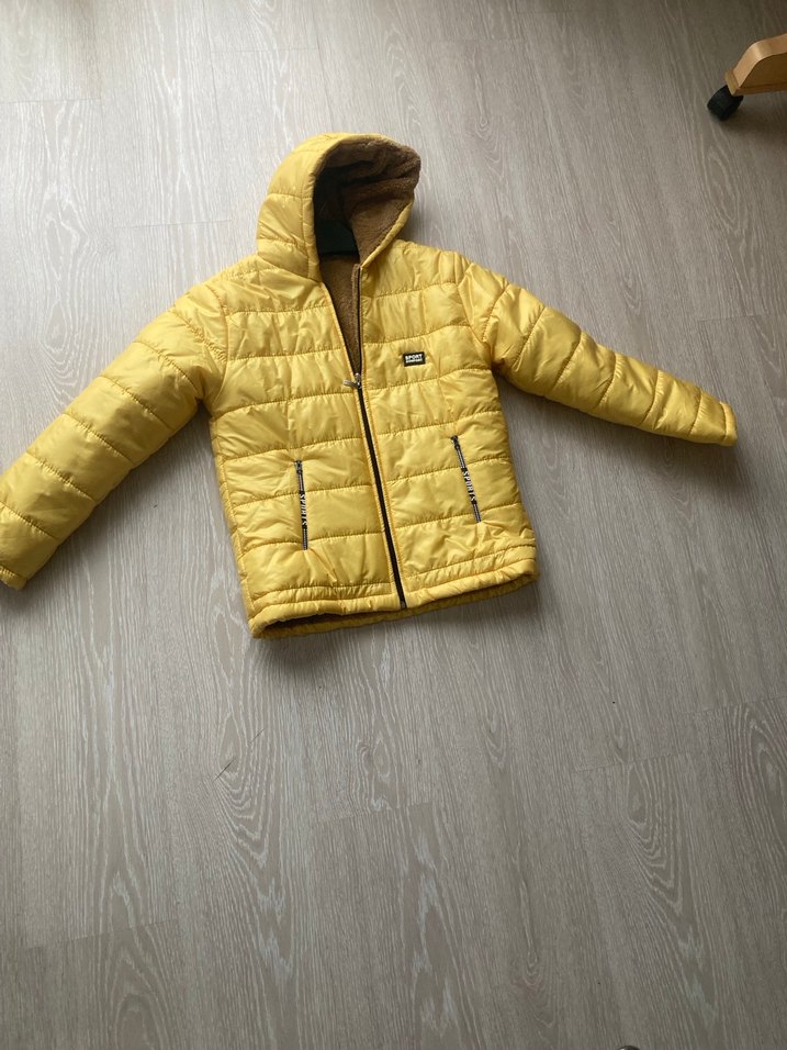 Parlak sarı renkli, fermuarlı cepleri olan, yumuşak ve sıcak kumaştan yapılmış, notched lapel yakalı, sade ve fitted erkek çocuk montu.