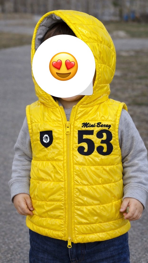 Çok az kullanıldı. Sarı renkli, kapüşonlu ve düğmeli, erkek çocuk yeleği. Pamamsı yumuşak kumaştan, baskılı desenli ve dar kesim. Trendy rahat stil için uygun.