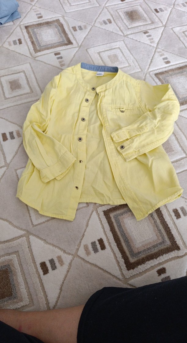 Açık sarı renkli, keten kumaştan yapılmış, uzun kollu ve bol kesim erkek çocuk gömleği. Düğmeli ön kısmı ve yakalı tasarımı ile sade bir stil sunar.