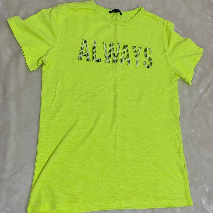 Sarı renkte, kısa kollu ve yuvarlak yakalı erkek çocuk tişörtü. Keten kumaştan üretilmiş, bol kesim ve önünde 'ALWAYS' baskısı bulunur.