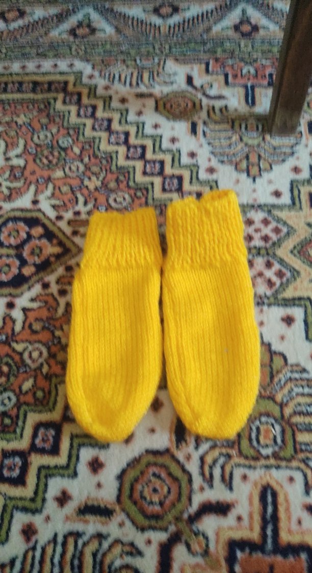 Sarı renkli, örgü malzemeden yapılmış erkek çocuk corap, sade ve desensiz tasarımıyla renkli ve temel bir görünüme sahiptir.
