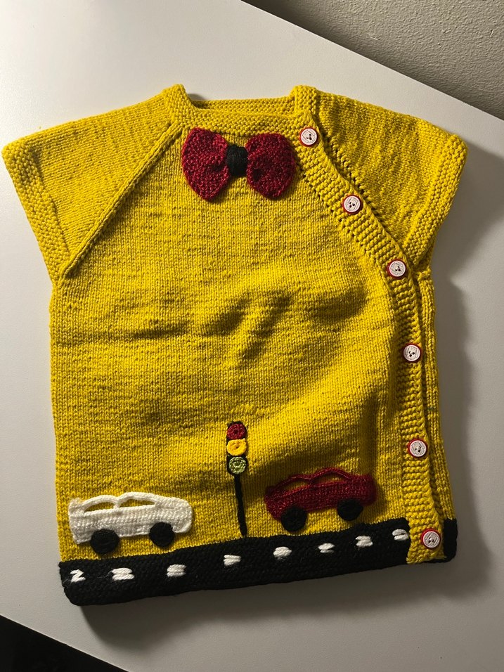 Sarı renkli, kolsuz, örgü erkek çocuk yeleği. Bisiklet yaka, yan düğme detaylı ve renkli araba ile trafik ışığı aplikeleri bulunur.