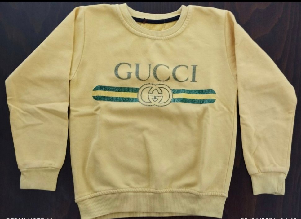 Sarı pamuklu erkek çocuk sweatshirt, yuvarlak yaka ve uzun kolludur. Renkli baskılı,ve bol kesimdir. GUCCI logosu vardır. Trend sokak stili için uygundur. fotoda gösterdiğim koltuk altında minik sökük var bir kolunda da minik leke var. genel durumu çok iyi rahat giyilebilir bize küçük geldiği için satışda