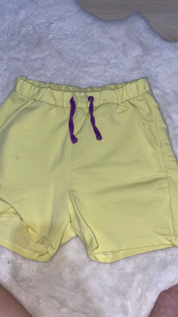 Yumuşak ve sıcak kumaştan, mor bağcıklı, rahat kesim sarı erkek çocuk şortu. Günlük kullanım için uygundur.
