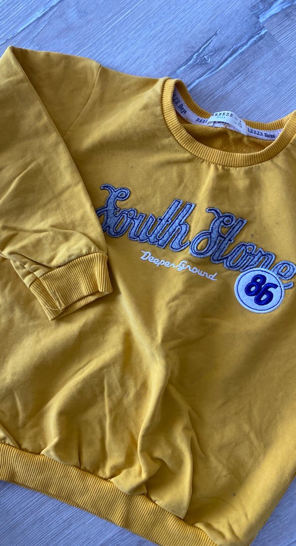 Sarı renkli, uzun kollu, yuvarlak yakalı erkek çocuk sweatshirtü. Baskılı, bol kesim ve yumuşak, sıcak örgü kumaştan üretilmiştir.