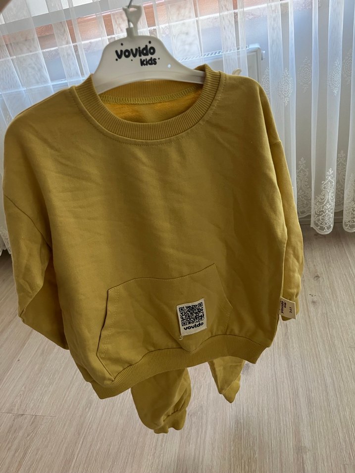 Sarı renk, uzun kollu, yuvarlak yakalı, bol kesim erkek çocuk sweatshirt. Önünde QR kodlu cepli, yumuşak ve sıcak kumaştan yapılmıştır. Marka: Vovido.