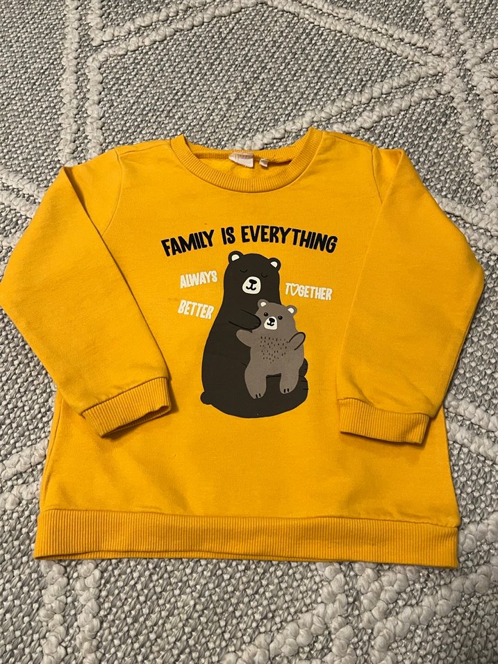 Sarı renkli, uzun kollu ve bisiklet yaka erkek çocuk sweatshirtü, bol kesimdir. İki ayı figürü ve "Family is Everything" yazısı baskılıdır, tüylü detaylar bulunur.