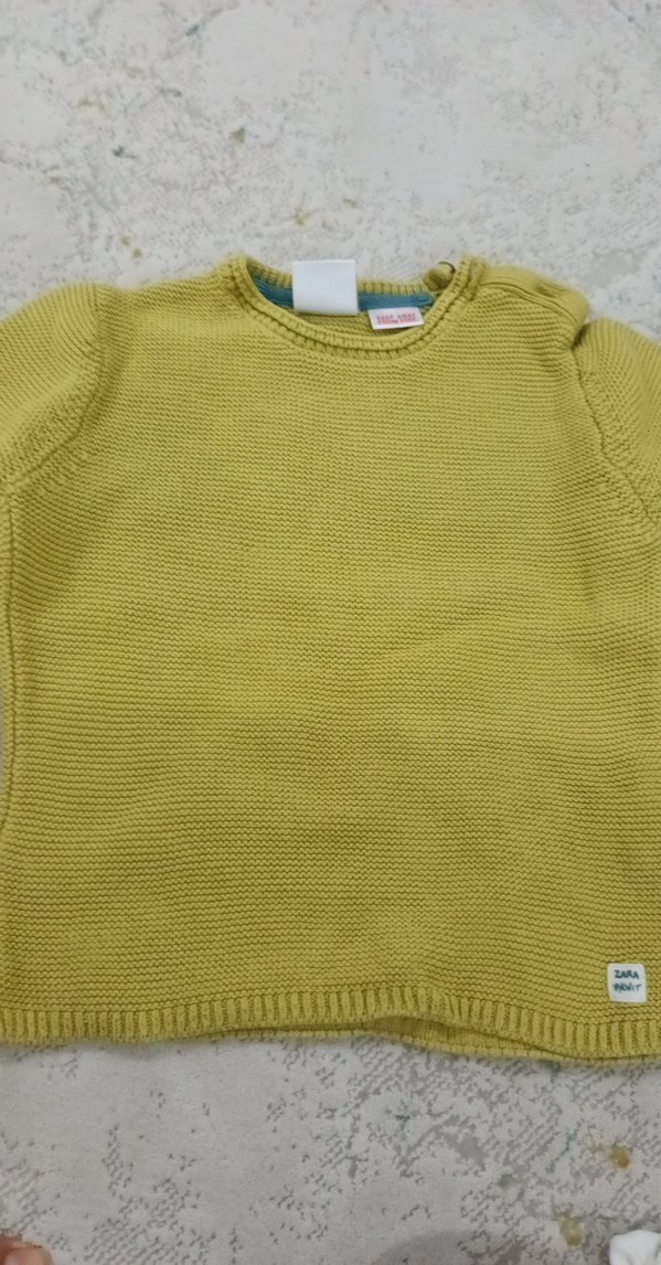 Sarı renkli, triko örme, yuvarlak yaka ve uzun kollu erkek çocuk kazak. Rahat ve bol kesim, basic ve sade tasarım