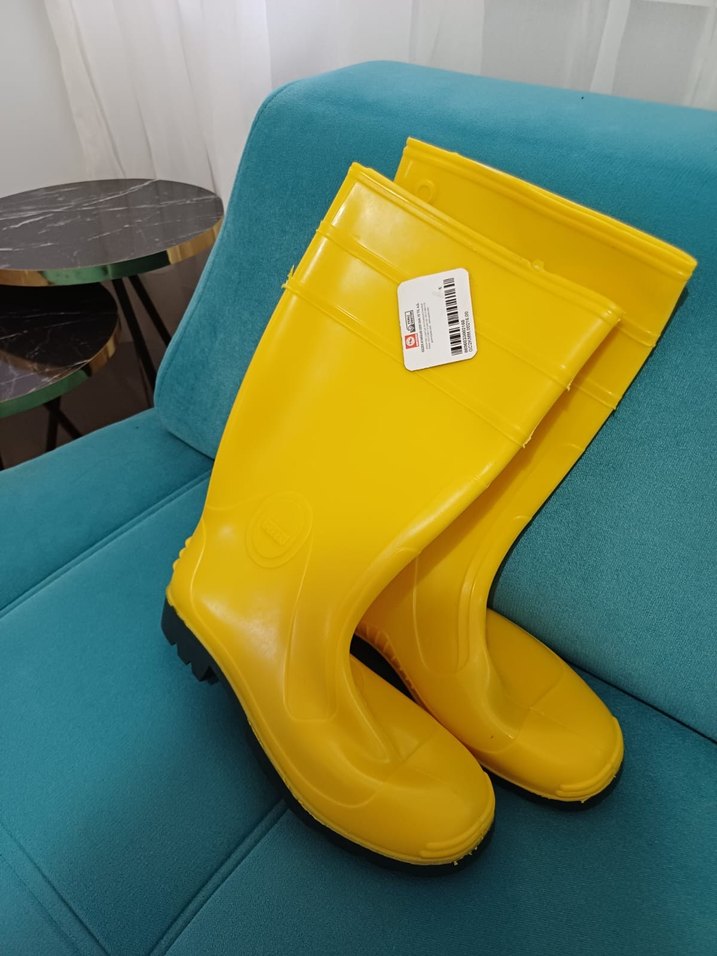 Sarı renkte, kauçuk malzemeden yapılmış, düz tasarımlı, erkek diz boyu botlar. Günlük ve sokak stiline uygun. şu gecirmez