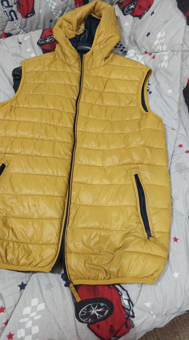 Yüksek yakalı, fermuarlı ve parlak sarı renkte, dar kesim erkek çocuk yeleği. Sokak stiline uygun, kolsuz tasarım.