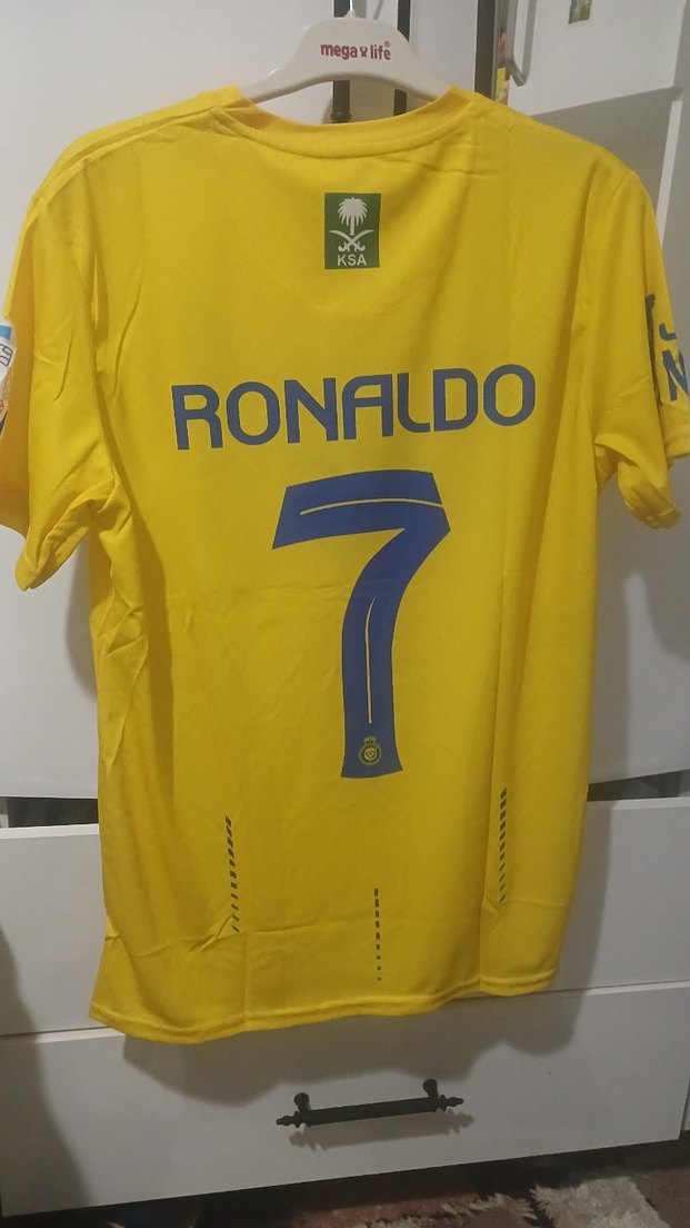 Sarı renkli, kısa kollu, yuvarlak yakalı erkek forma. 'RONALDO' yazısı ve 7 numara baskılı, sentetik kumaştan, spor ve günlük kullanıma uygun, düğmeli detaylı. ⚽