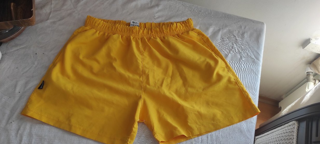 Sentetik kumaştan, düğmeli detaylı, parlak görünümlü, bol kesim sarı hamile midi şortu. Outdoor ve sokak stiline uygun.