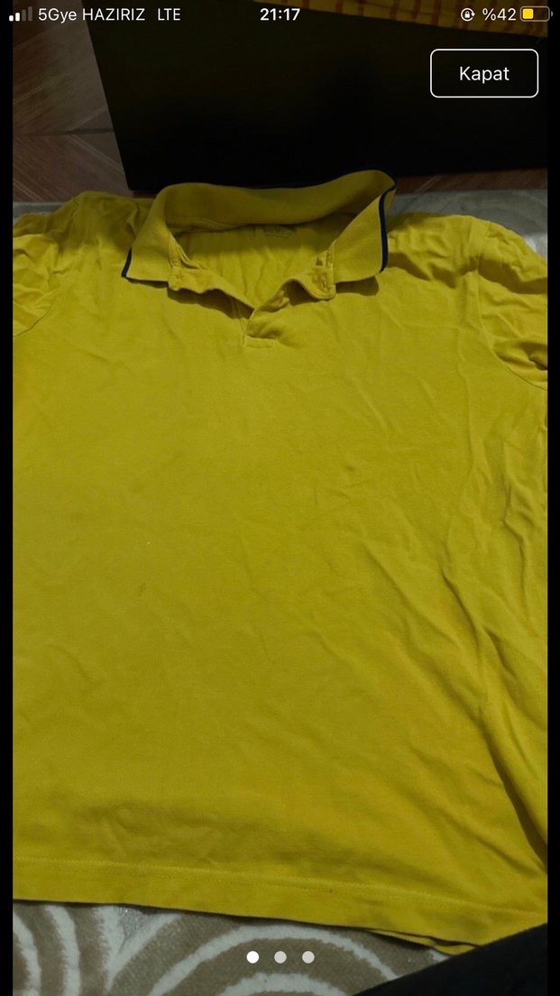 Parlak sarı renkli, polo yakalı ve kısa kollu erkek tişörtü. Rahat kesim ve sentetik kumaştan, günlük sokak stiline uygun.