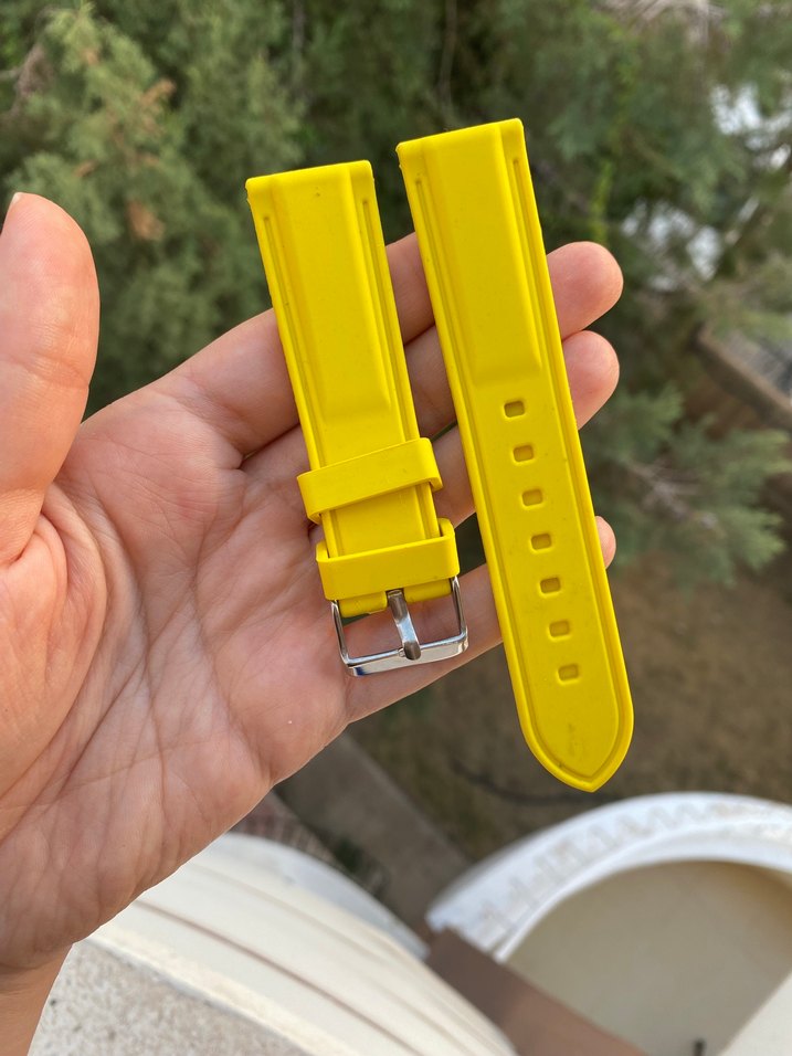 Canlı sarı renkte, minimalist tasarımlı erkek saat kayışı. Yumuşak ve rahat malzemeden, klasik tokalı.