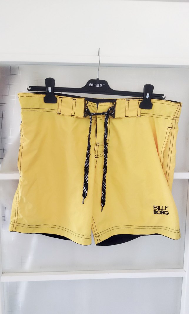 Sarı, bol kesim erkek şort mayo, kemerli ve parlak yüzeyli.