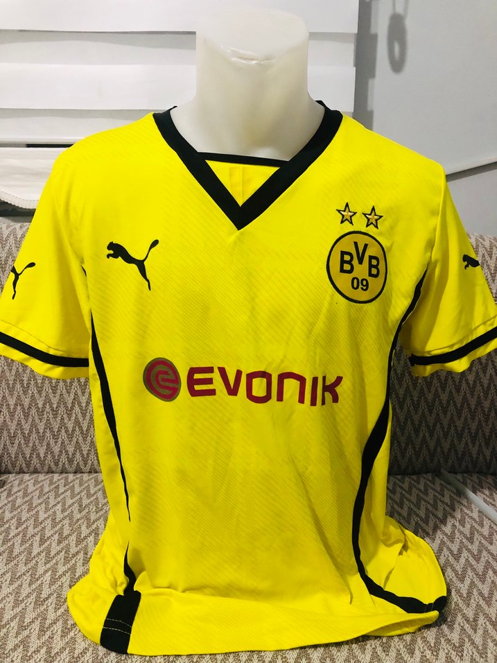 Sarı renkli erkek spor forması, bisiklet yaka ve kısa kollu, BVB 09 baskılı ve düğmeli detaylı. Bol kesim, sokak modasına uygun stil.
