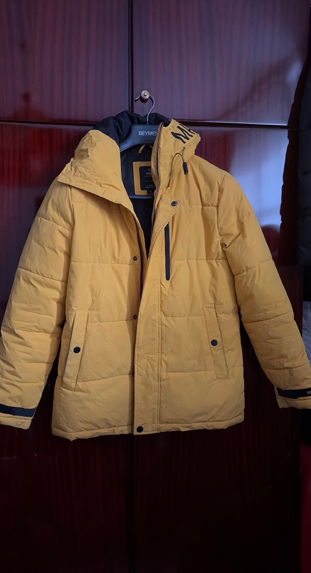 Sarı renkli, düğmeli, normal boyda erkek mont. Notlu yaka ve parlak yüzeye sahip, günlük rahat kullanıma uygun uzun kollu model.