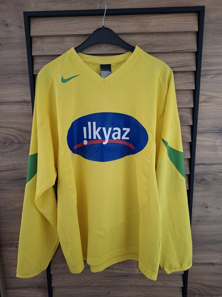 Sarı renkli erkek uzun kollu spor sweatshirt, bol kesim ve bisiklet yaka ile tasarlanmıştır. Önünde 'ilkyaz' baskısı, kollarda yeşil detaylar ve velcro özelliği bulunur. Yumuşak ve sıcak kumaştan üretilmiştir. Nike logosu mevcuttur.