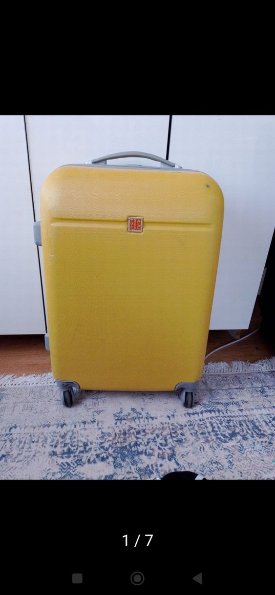 Sarı renkte, tokalı erkek valiz. Hafif ve desensiz yüzeyi, vintage ve bohem tarzıyla uyumlu. Tekerlekli ve taşıma saplı.