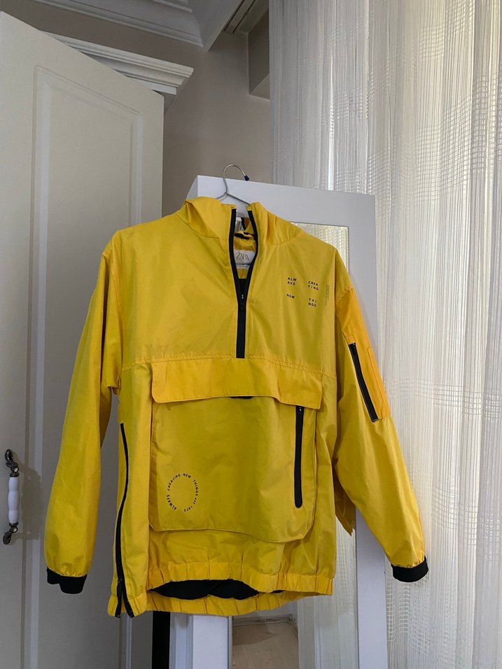 Parlak sarı renkte, yüksek yakalı, uzun kollu ve bol kesim erkek midi yağmurluktur. Fermuarlı detaylara sahiptir, dış mekan kullanımı için uygundur. ️