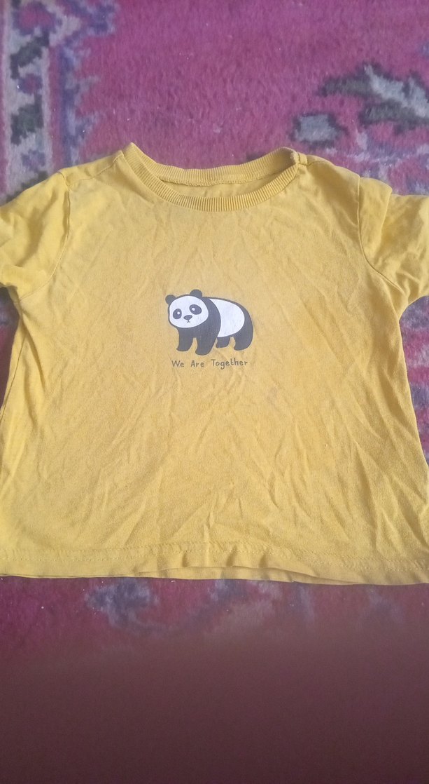 Pamuk kumaştan yapılmış, sarı renkli, rahat kesim ve bisiklet yaka erkekçocuk tişörtünde panda baskısı ve 'We Are Together' yazısı bulunur.