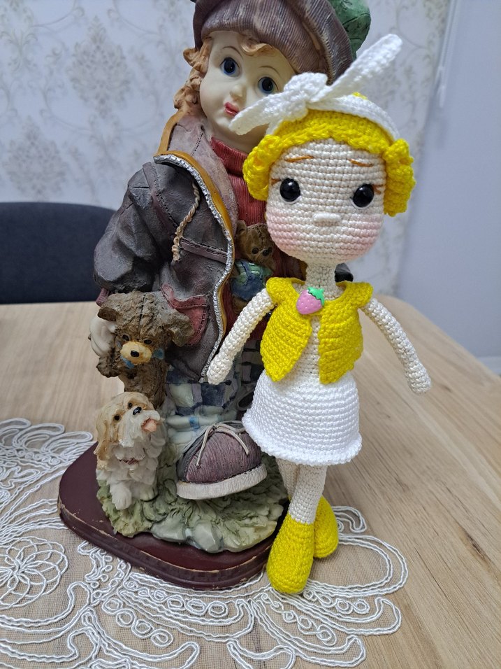 El yapımı örgü bebek, açık sarı elbise, uyumlu ayakkabılar ve beyaz fiyonk detaylı saç bandına sahiptir. Yumuşak dokulu, dekoratif ve oyuncak olarak kullanılabilir.