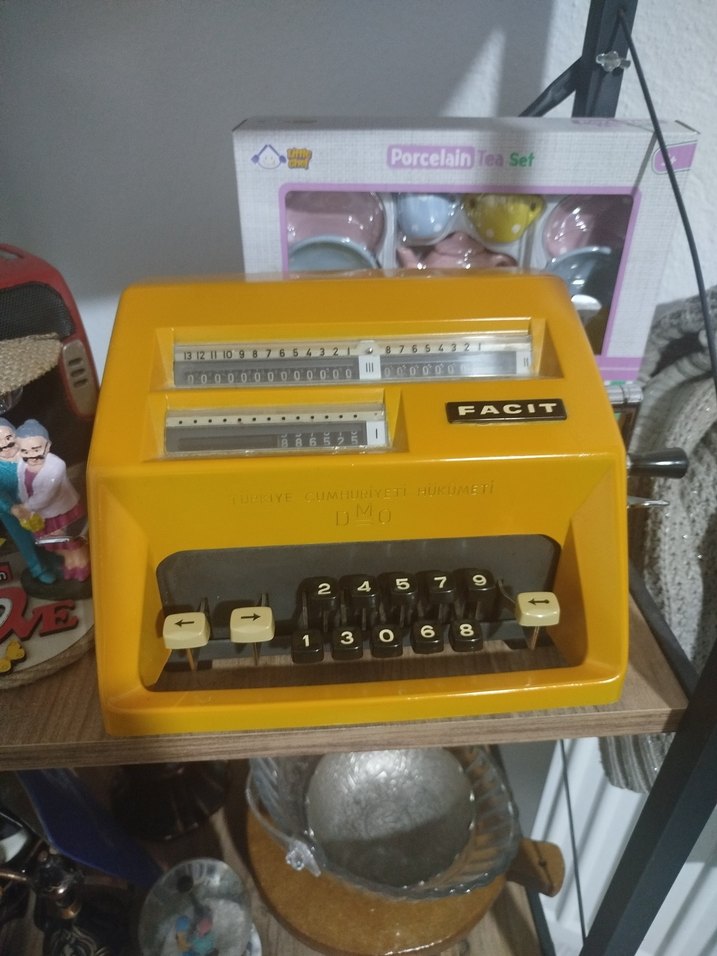 Sarı renkte Facit markalı hesap makinesi, retro tasarıma sahip ve sayısal tuşları bulunur. Çalışma alanına nostaljik bir hava katar. ️