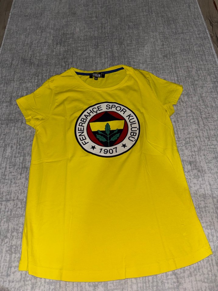 Sarı, yumuşak ve sıcak kumaştan, kısa kollu, bol kesim kadın tişörtü. Fenerbahçe Spor Kulübü baskılı, yuvarlak yaka ve cırt cırt detaylı.