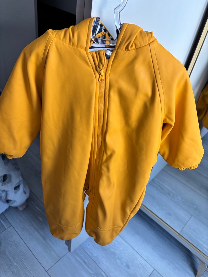 Parlak sarı renkli, kapüşonlu ve fermuarlı bebek kayak tulumu, yumuşak ve sıcak kumaştan üretilmiştir.