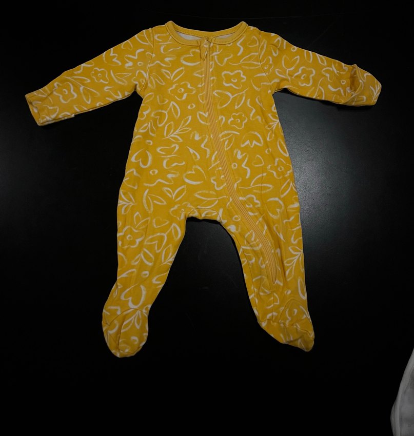 Sarı renkli, canlı desenli bebek tulumu, kolay giydirme için ön fermuarlı. Yumuşak dokulu, uzun kollu ve ayaklıdır.