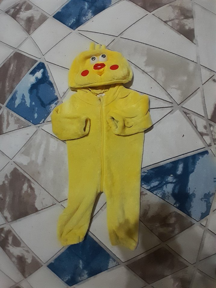 Yumuşak ve sıcak kumaştan, fermuarlı ve kapüşonlu sarı bebek tulumu, eğlenceli yüz tasarımıyla rahatlık sağlar.