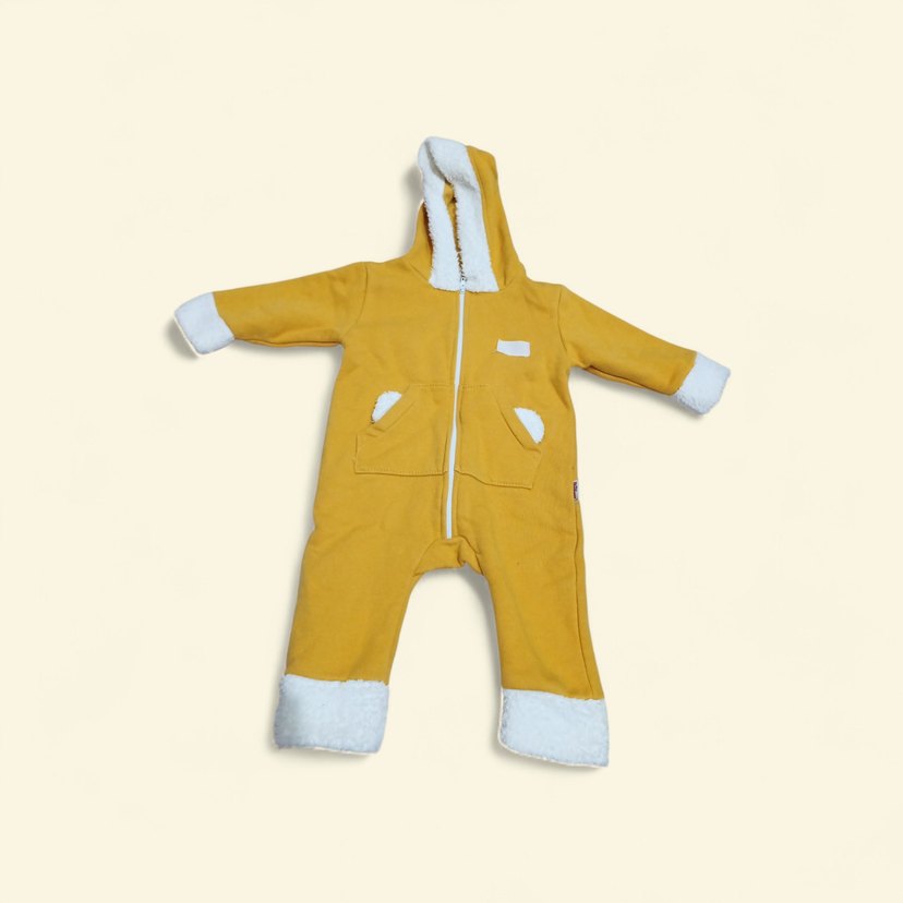 Sarı renkte, yumuşak ve sıcak kumaştan fermuarlı bebek tulumu. Kapüşonlu, cepli ve beyaz detaylıdır. Soğuk günler için uygundur. ❄️
