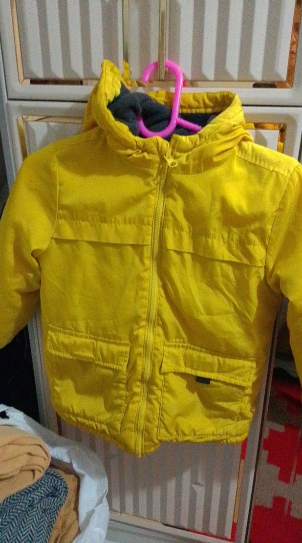 Fermuarlı, sarı renkli erkek çocuk montu, notlu yaka ve soft sıcak kumaştan yapılmıştır. Renkli ve trend sokak stili için uygundur.