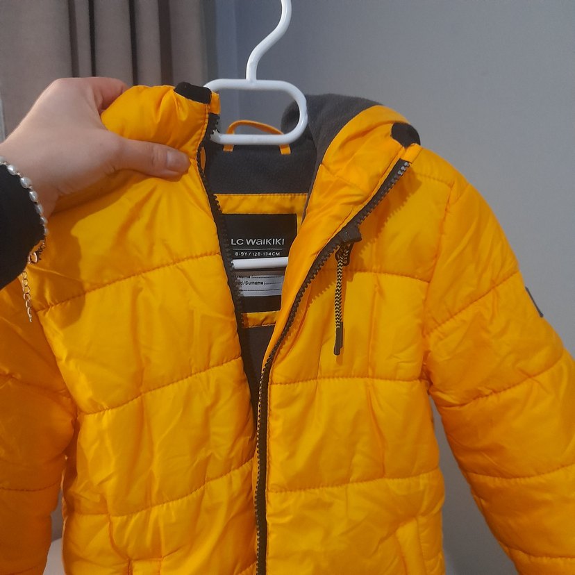 Sarı ve gri renklerde, fermuarlı ve yakalı, yumuşak dokulu erkek çocuk montu. Sokak stiline uygun, dar kesim tasarım.